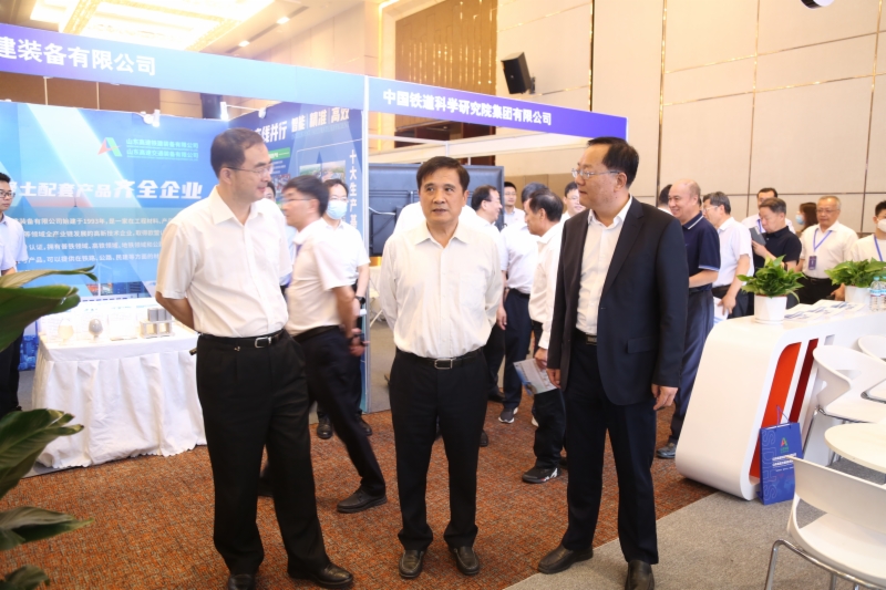 會(huì)議期間,黃民一行到集團(tuán)展廳及會(huì)議現(xiàn)場(chǎng)展區(qū)參觀交流,集團(tuán)推出的山東鐵路智能化建設(shè)管理平臺(tái)、CRTSⅢ型板式無砟軌道智能施工技術(shù)與裝備引得眾人關(guān)注。山東鐵路智能化建設(shè)管理平臺(tái)是以數(shù)字技術(shù)賦能高鐵智能化建設(shè)的重大成果,該平臺(tái)包含從設(shè)計(jì)到施工再到運(yùn)營(yíng)階段36個(gè)板塊、390多個(gè)功能模塊,實(shí)現(xiàn)了鐵路建設(shè)全生命周期管理,形成了“一張圖、數(shù)字化、智能化、可視化”的管理特色。平臺(tái)已在濟(jì)濱高鐵項(xiàng)目全面推廣應(yīng)用,取得了良好成效,累計(jì)產(chǎn)生數(shù)據(jù)量70余萬條,活躍用戶8000多人。CRTSⅢ型板式無砟軌道智能施工技術(shù)與裝備是指CRTSⅢ型板式無砟軌道“測(cè)量-調(diào)整-支護(hù)-灌注”一體化施工裝備,并與配套施工工裝之間無縫銜接,能夠提高施工效率50%以上,減少人力1/3以上,實(shí)現(xiàn)施工全過程質(zhì)量可控,并可拓展到其它類型無砟軌道施工中。