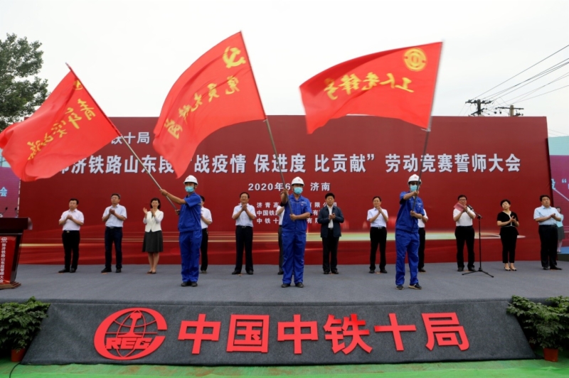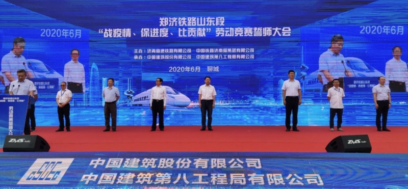 6月18日,鄭濟(jì)高鐵山東段“戰(zhàn)疫情 保進(jìn)度 比貢獻(xiàn)”勞動(dòng)競(jìng)賽誓師大會(huì)在濟(jì)南、聊城兩地同時(shí)舉行。省交通廳總工程師趙方德、省交通工會(huì)主席牟艷紅、集團(tuán)董事長(zhǎng)姜長(zhǎng)興、濟(jì)南鐵路局集團(tuán)董事長(zhǎng)王新春、中鐵十局集團(tuán)董事長(zhǎng)李學(xué)民等在濟(jì)南會(huì)場(chǎng)參加活動(dòng)。