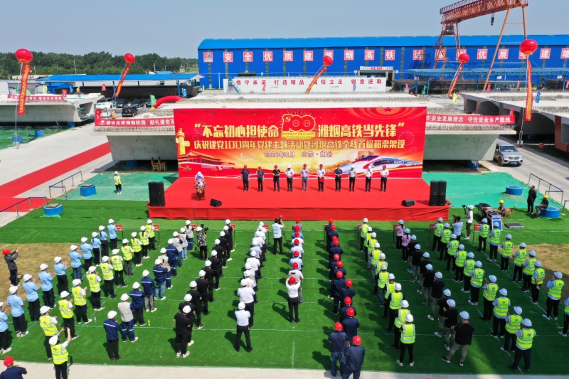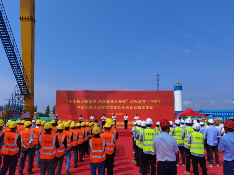 6月26日,山東重點鐵路工程項目濰煙高鐵、萊榮高鐵在煙臺和威海兩地同時舉行慶祝建黨100周年黨建主題活動暨首榀箱梁架設活動。