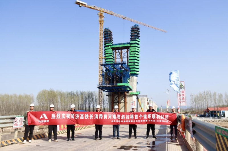 在前期施工過程中,鐵投集團主要領(lǐng)導多次組織濟鄭公司及濟南局集團鄭濟工程建設(shè)指揮部指導山東路橋項目部結(jié)合跨黃河矮塔斜拉橋建設(shè)特點,超前謀劃、科學組織、合理調(diào)配資源、分解目標計劃、細化工期安排,克服了異形橋塔索鞍定位、大體積混凝土、冬期極寒天氣、黃河大流量下泄排洪等不利因素,順利完成首個主墩索塔封頂。首個主墩索塔的順利封頂,標志著大橋即將進入斜拉索掛索施工,為后期的全橋合龍以及2023年底全線開通奠定了良好的基礎(chǔ)。