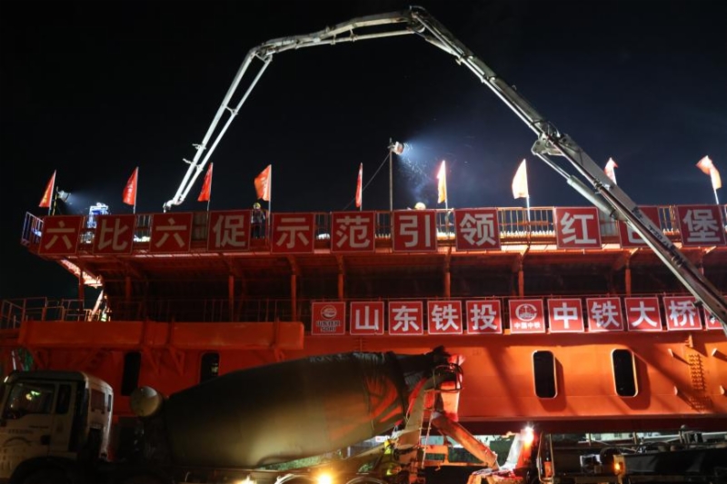 為確保此次澆筑順利完成,濟(jì)濱高鐵公司堅(jiān)持嚴(yán)要求、高標(biāo)準(zhǔn)施工,組織項(xiàng)目部合理配置資源,先后召開移動(dòng)模架專項(xiàng)施工方案專家評(píng)審會(huì)、移動(dòng)模架專項(xiàng)施工方案技術(shù)研討會(huì),為現(xiàn)場(chǎng)施工提供技術(shù)支撐。創(chuàng)新工藝工法,采用移動(dòng)模架施工,機(jī)械化程度高、結(jié)構(gòu)受力明確,實(shí)現(xiàn)了連續(xù)循環(huán)作業(yè),滿足技術(shù)、經(jīng)濟(jì)、結(jié)構(gòu)和運(yùn)行穩(wěn)定性、施工方便性等各方面的要求。此外,單孔施工周期短、安全質(zhì)量可控,既節(jié)省了勞動(dòng)力、降低了勞動(dòng)強(qiáng)度,還大大減少了對(duì)土地占用以及對(duì)生態(tài)環(huán)境的破壞。充分發(fā)揮濟(jì)濱高鐵黨建聯(lián)盟優(yōu)勢(shì)作用,黨員先鋒隊(duì)、青年突擊隊(duì)精心組織、超前謀劃,不斷優(yōu)化施工方案,多次開展專項(xiàng)培訓(xùn)和技術(shù)交底,有力彰顯了黨支部戰(zhàn)斗堡壘和黨員先鋒模范作用。