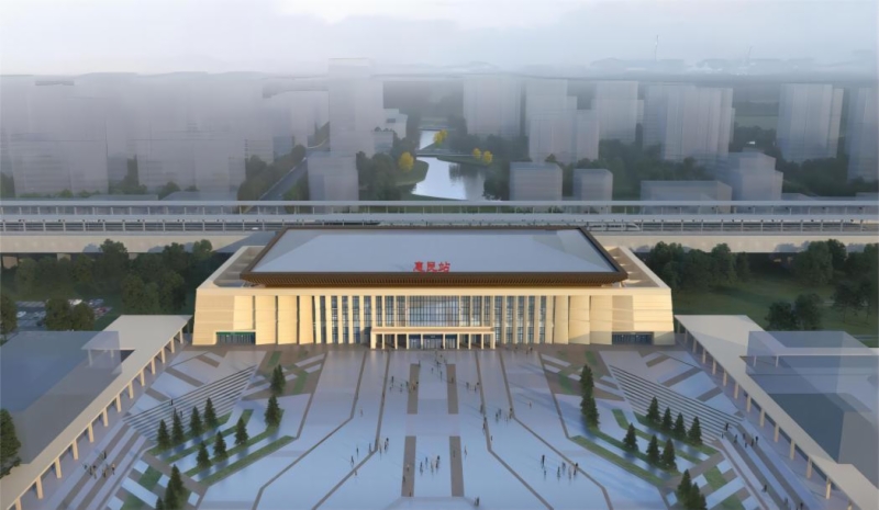 惠民站設(shè)計以“兵圣故里,雄闊惠民”為概念,車站設(shè)兩座凈寬10m的進(jìn)、出站通道,兩座長450m,寬12m漸變至9.05m的島式站臺,線側(cè)下式站型,雨棚覆蓋面積10547㎡,站房點建筑面積為9987㎡,建筑層數(shù)主體建筑地上一層,兩側(cè)局部設(shè)置二層夾層,地下局部一層。建筑總高度為23.45m,最高聚集人數(shù)為800人,站房主體結(jié)構(gòu)計劃2025年6月完工。