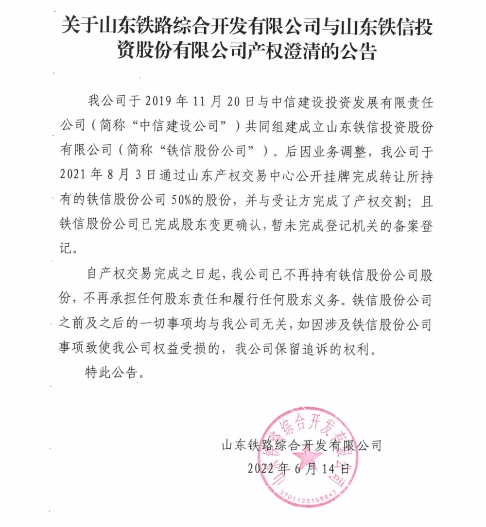 關(guān)于山東鐵路綜合開發(fā)有限公司與山東鐵信投資股份有限公司產(chǎn)權(quán)澄清的公告